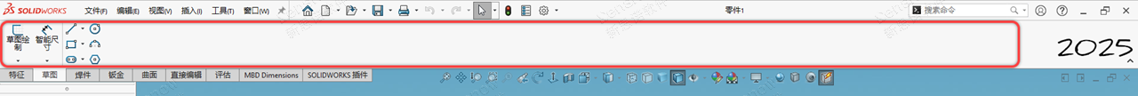 此处为 SOLIDWORKS 2021 版本增强功能【可折叠的CommandManager】,此功能与我们 Office 文档同理,是一个折叠功能区,为了展现更大的绘图区域,让不同习惯的用户可以自由切换。由 CommandManager 按钮区域页面右下角的小按钮进行控制;