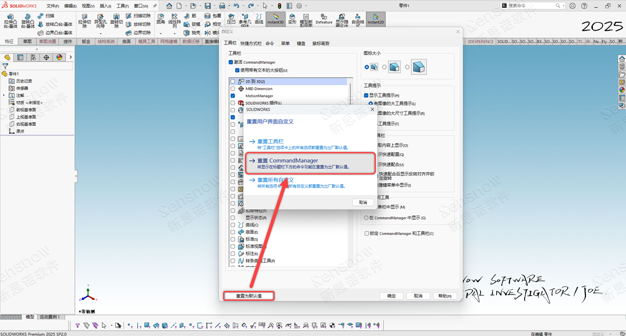 使用“保存/恢复设置”的方式将同事计算机中的 SOLIDWORKS 设定进行保存,并拿到当前有问题的计算机中使用相同方式导入设置。