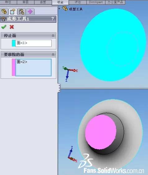 图二为设置了成型特征以后的零件状态,选择 文件-〉另存为(保存类型选择:Form Tool(*.sldftp)),将文件保存为成型特征类型,然后在设计库中添加保存的文件路径即可将此成型工具用于钣金的成型设计(从设计库中将成型工具拖放到钣金件上),如下图: