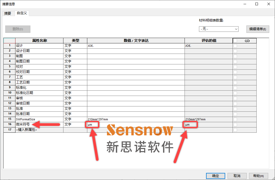 可在工程图自定义属性中创建一个名称为 '微米符号' 的属性,属性表达式使用我们常用的输入法将微米字符 'μm' 进行输入,计算的结果值就是符号。
