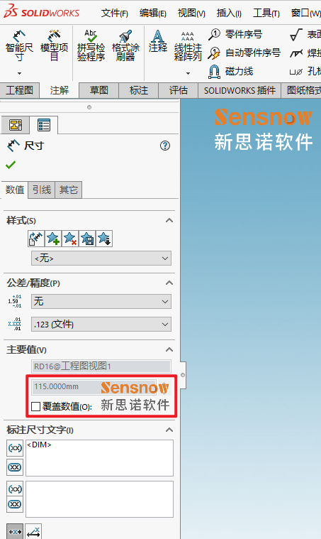 勾选:选项 -> 文档属性 -> 尺寸-> 用不同的颜色高亮显示覆盖尺寸,此时整个图面中所有存在覆盖数值属性的尺寸均以不同颜色高亮凸出显示。