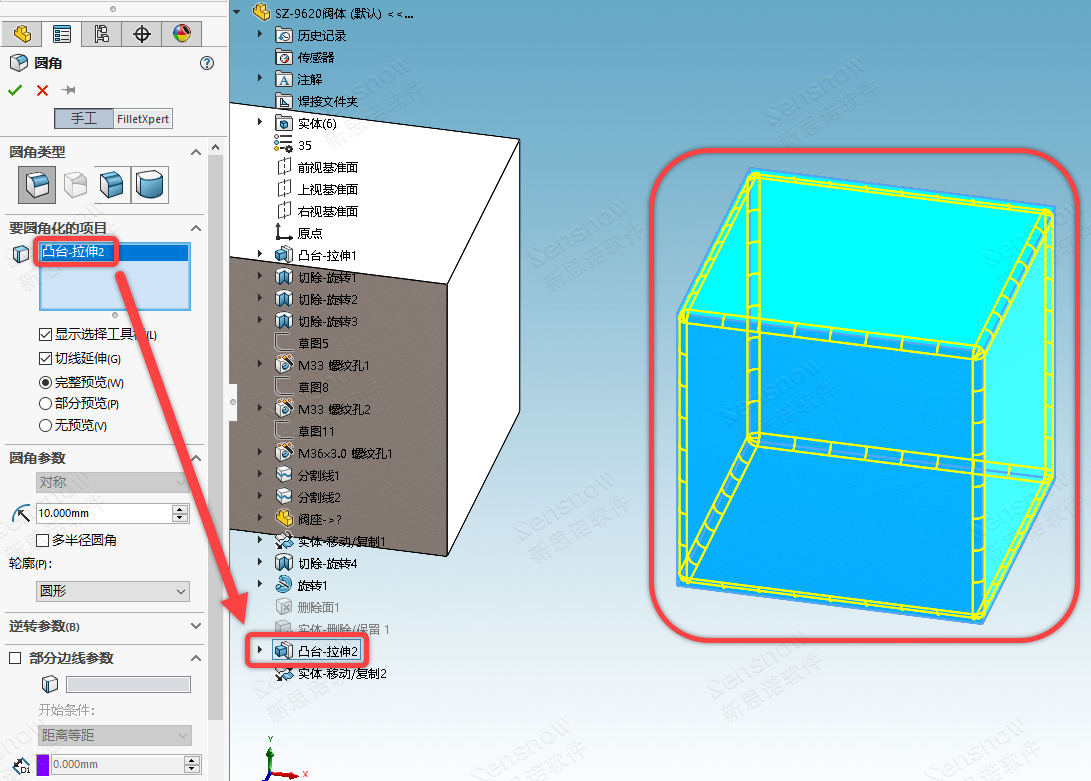 选择特征就是点选一个特征,比如一个拉伸特征,点中后此特征上的所有尖角处的模型边线都将被选中并参与倒角。