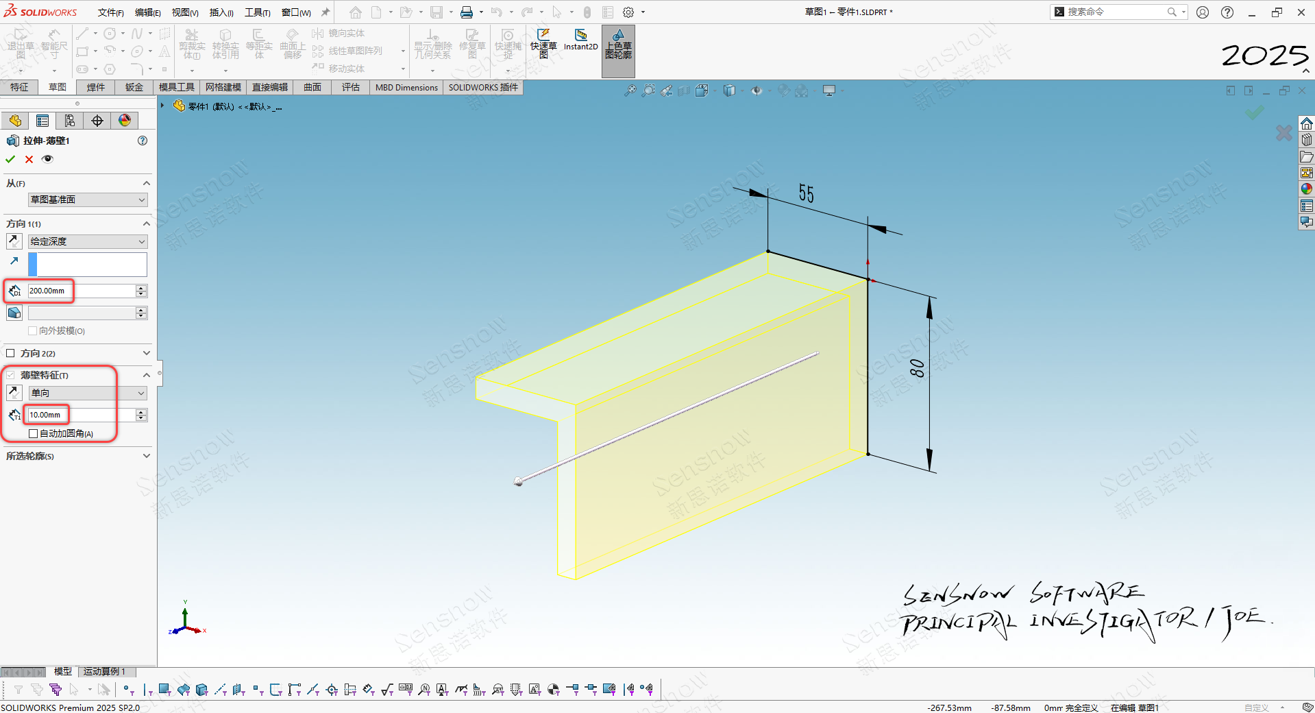 1、 拉伸主体:两条直线尺寸为 55 毫米和 80 毫米。拉伸厚度 200 毫米,拉伸使用薄壁特征,方向向内厚度 10 毫米,毫无难度;